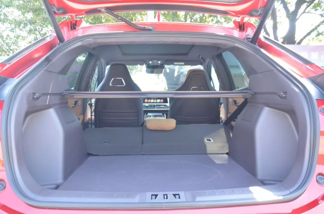 至于后排,它的后排座椅支持四六比例放倒,座椅放倒后可以形成全平空间,后备箱打开后基本不用愁。